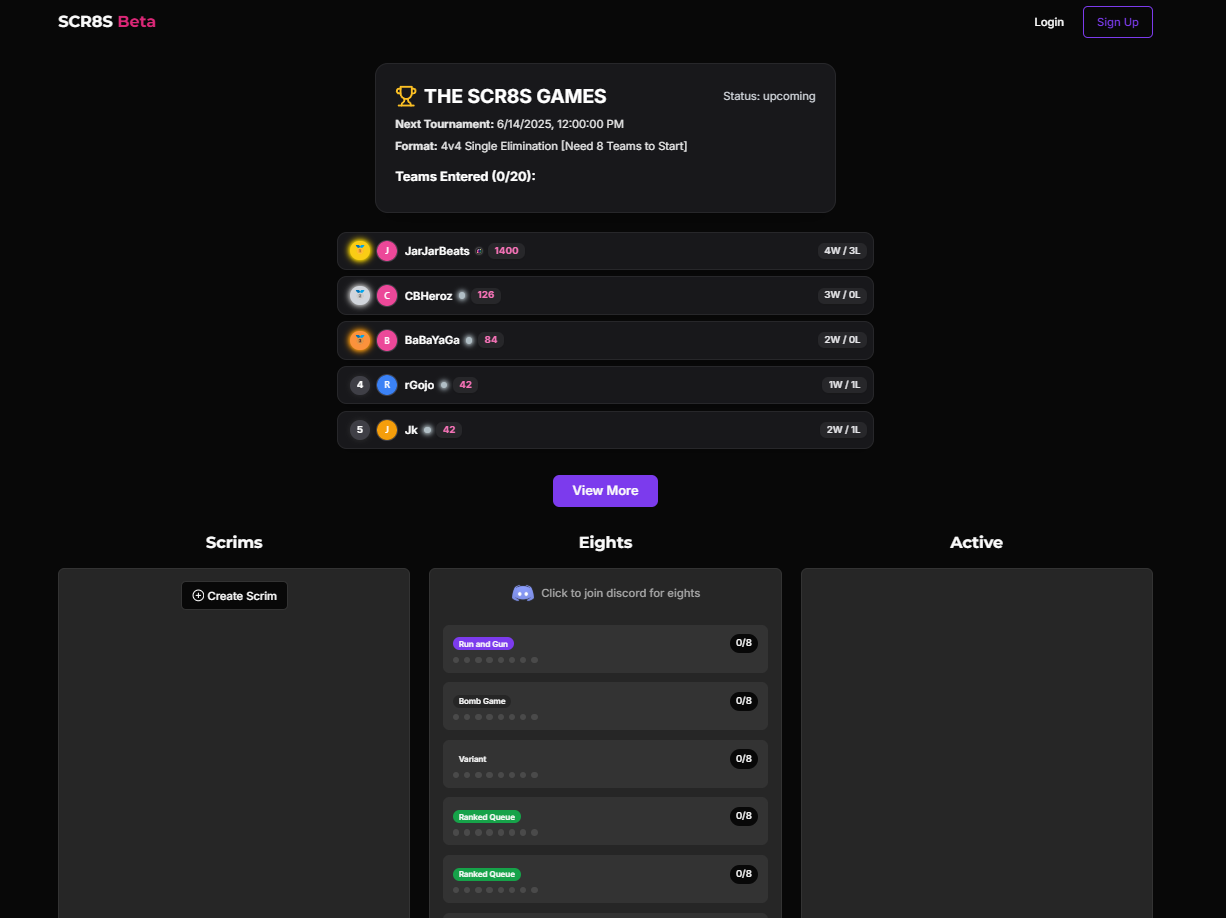 SCR8S is a Competitive gaming platform website built with Next.js, Tailwind CSS, and PostgreSQL. It allows users to create and join tournaments, track their progress, and compete with other players.